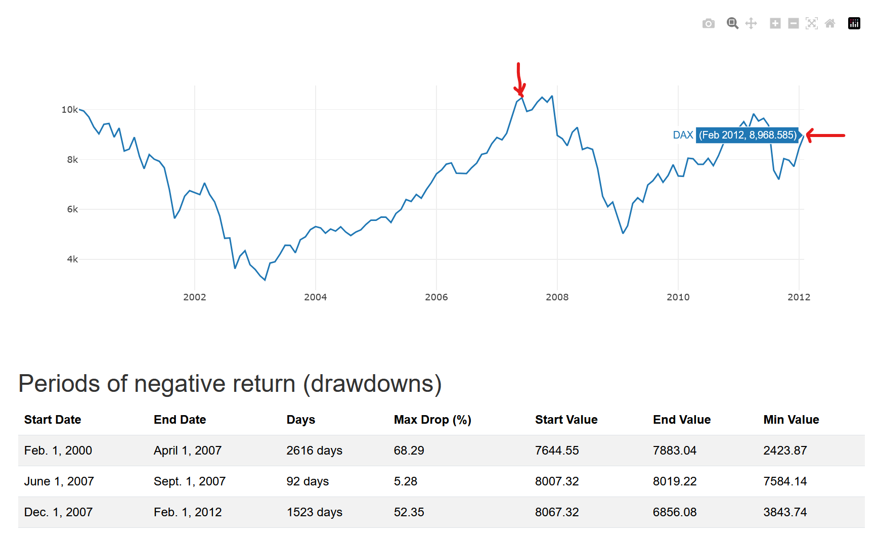 DAX, Index of 40 blue chip german companies, similarly had negative returns for more than 10 years. Accounting for dividends returns were flag or marginally negative. Accounting for inflation they were bad.