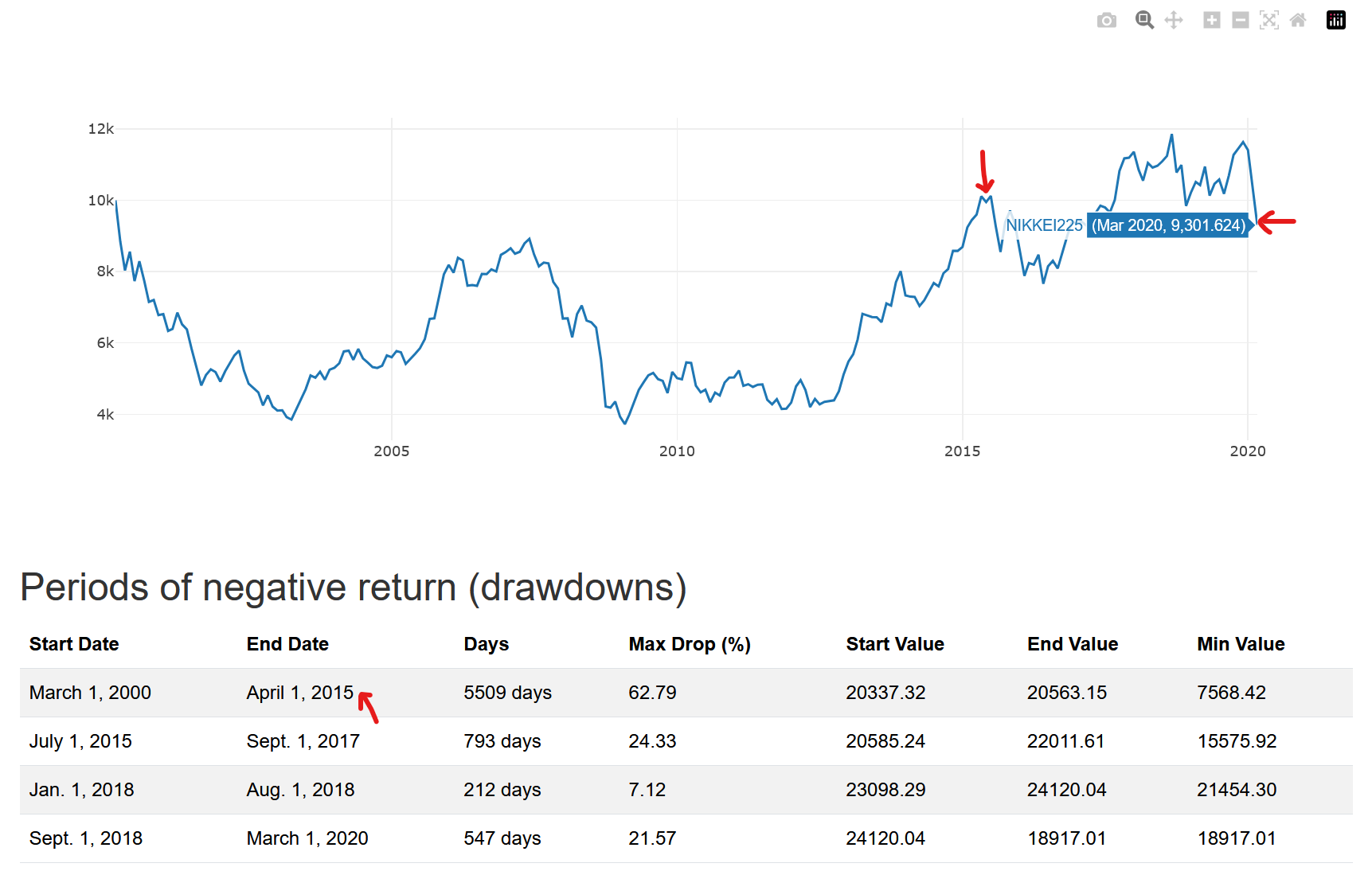 Nikkei 225, Japanese index, had negative returns for more than 20 years.